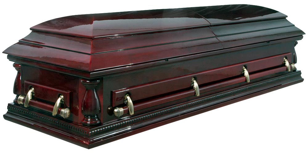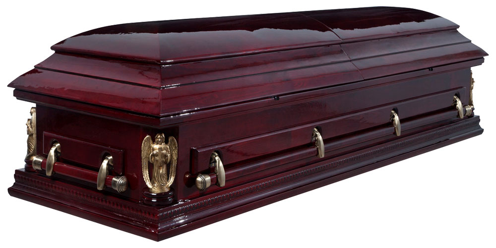 Престижный двухкрышечный гроб из массива дерева. Изделие представлено в двух цветовых вариантах: натуральный дуб и благородная вишня. Гроб имеет форму четырехгранника. Отличительной чертой данной модели является удобная форма крышки гроба для проведения последней ритуальной церемонии и прощания. На откидной крышке нанесена золотистыми нитями цитата из молитвы: «Святый Боже, Святый Крéпкий, Святый Безсмéртный, помилуй нас». Четырехгранник оснащен цельными ручками, которые крепятся по всей длине гроба, что делает процесс переноса максимально удобным. Глянцевый гроб оборудован микролифтом ложе, что позволяет правильно расположить тело умершего любого телосложения в гробу. Постель гроба выполнена из мягкого флиса с рюшей.